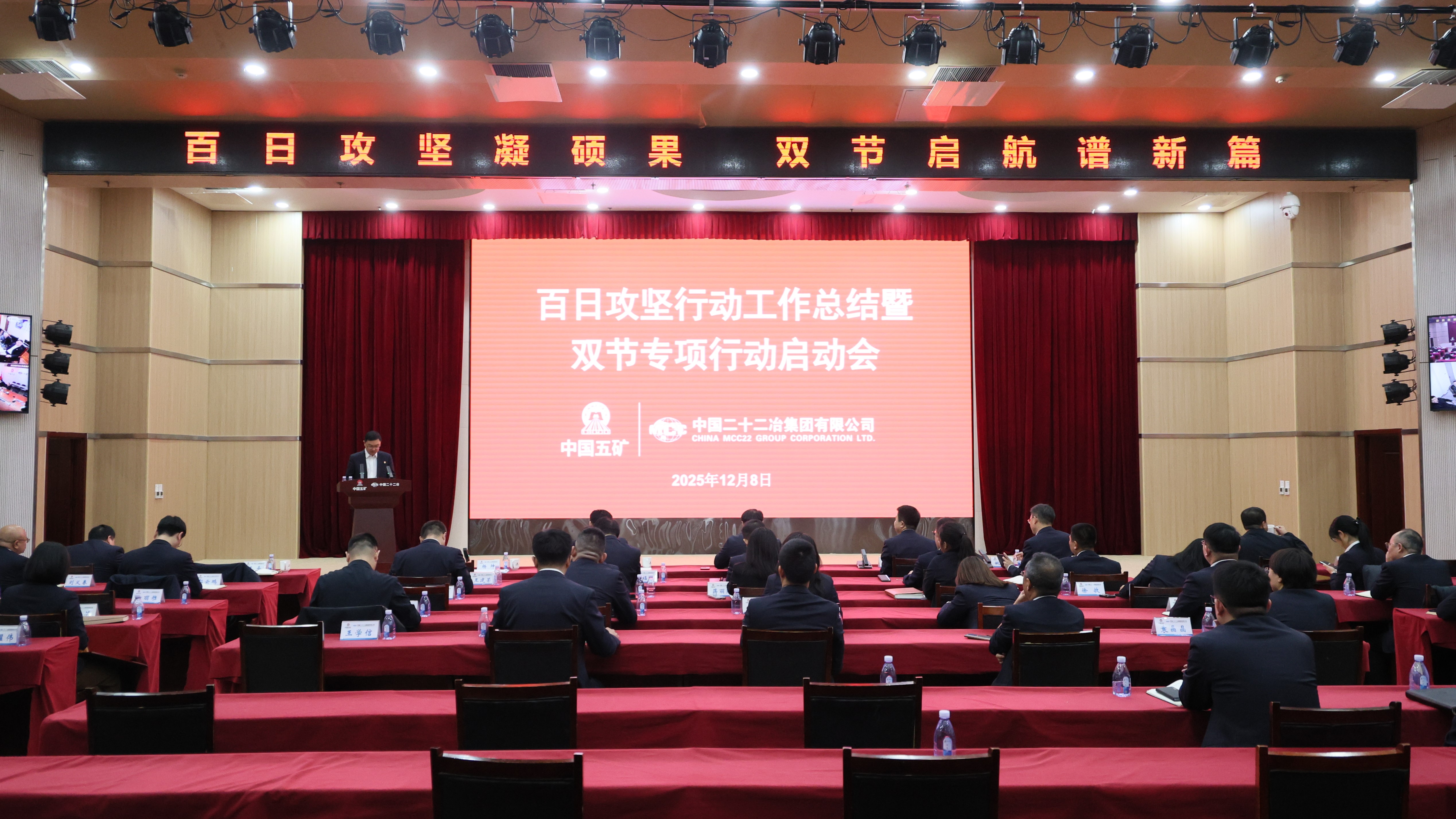 12月8日,中國二十二冶召開百日攻堅行動工作總結暨雙節專項行動啟動會議,旨在復盤百日攻堅成果、表彰先進典型、提煉經驗方法,同時部署“元旦、春節”雙節專項行動,凝聚奮進力量再啟新程。中國二十二冶黨委書記、董事長袁斯浪,黨委副書記、職工董事張育鵬,副總經理趙山虎,副總經濟師張蓋出席。會議由總會計師楊坤主持。